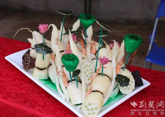 在楊家灣村舞臺上,“蘿卜雕刻”正吸引著游客們的眼球。黃州東坡美食的傳承人張彬展示著自己的作品“荷塘玉藕”,晶瑩剔透、惟妙惟肖,令許多游客驚嘆不已。