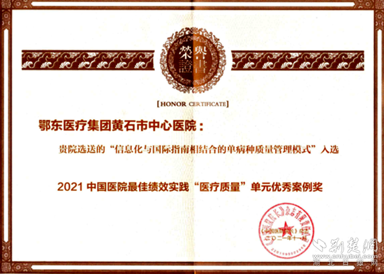 荊楚網(wǎng)(湖北日?qǐng)?bào)網(wǎng))訊(通訊員 石紅兵)近日,2021年第二屆全國(guó)績(jī)效大會(huì)標(biāo)桿管理案例評(píng)選結(jié)果揭曉,黃石市中心醫(yī)院參選的“信息化與國(guó)際指南相結(jié)合的單病種質(zhì)量管理模式”、“基于合理用藥系統(tǒng)的建立與運(yùn)用,降低住院次均藥品費(fèi)用”兩個(gè)案例,經(jīng)過(guò)嚴(yán)格遴選和評(píng)審,最終榮獲2021中國(guó)醫(yī)院最佳績(jī)效實(shí)踐“醫(yī)療質(zhì)量”優(yōu)秀獎(jiǎng)和“運(yùn)營(yíng)效率”優(yōu)秀獎(jiǎng)。