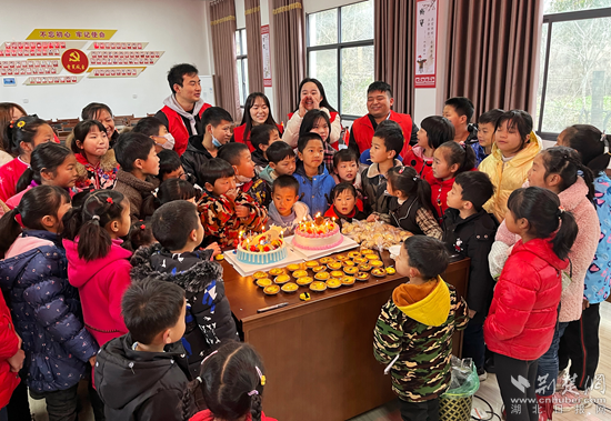 羅田縣青年志愿者與困難兒童一起吃蛋糕、吹蠟燭。通訊員 供圖