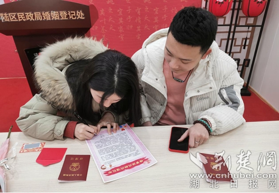據(jù)了解,為應(yīng)對當(dāng)日可能出現(xiàn)的登記高峰,該區(qū)民政局婚姻登記處通過網(wǎng)上預(yù)約、提前審核,電話通知預(yù)約新人認(rèn)真遵守疫情防控要求,按時(shí)到場辦理登記;實(shí)時(shí)調(diào)控現(xiàn)場人數(shù),減少登記人員往來和聚集,確保符合條件的每對新人都能領(lǐng)到結(jié)婚證。