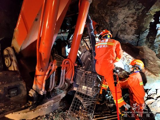 消防救援人員到達現(xiàn)場后發(fā)現(xiàn),現(xiàn)場因山體部分塌方,下方施工的挖掘機駕駛室被突然滾落的巨石砸中,導致有一名男子被困。了解情況后,現(xiàn)場救援人員立即對其進行破拆施救。