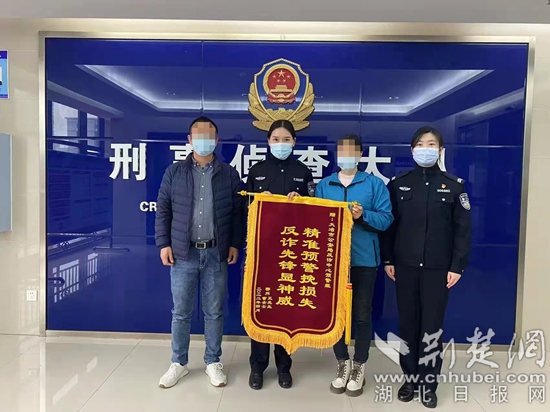 大冶市民曹女士及其丈夫?qū)⒁幻驽\旗送到大冶市公安局反詐中心。通訊員 供圖