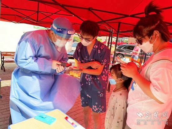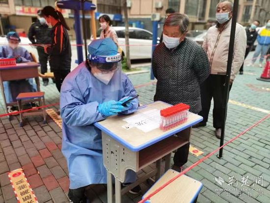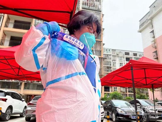 上午十點半,草草喝了幾口稀飯的她接到了上門為封控樓棟重點人員上門采樣的任務(wù),早已輕車熟路的她換好白色防護(hù)服,拿著酒精壺、棉簽和試劑盒,一路協(xié)同醫(yī)護(hù)人員上門檢測。