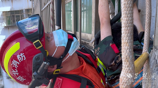 根據(jù)現(xiàn)場情況,消防救援人員穿戴好繩索救援裝備,用救援軟梯慢慢從樓頂下降至男孩被困位置,并為男孩戴好安全防護裝備。隨后消防救援人員合力將男孩小心翼翼地提拉至7樓窗口處被抱入屋內(nèi),被困男孩成功脫險。