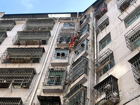 消防救援人員到達現(xiàn)場后,發(fā)現(xiàn)一名男孩被困在6樓窗外,距離地面約18米,雙手扒在防盜窗上,隨時有墜落的危險。