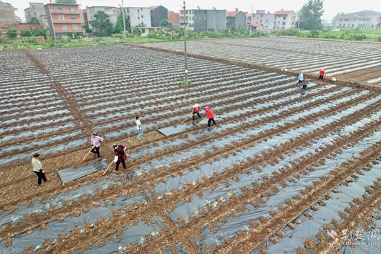 種植基地里,工人們頭戴草帽,在松土整地、地膜覆蓋,一張張流著汗水的臉上掛滿笑容?!霸谶@里務(wù)工,他們能流一分汗賺一分錢。”毛民安的底氣來(lái)源于“四金模式”。
