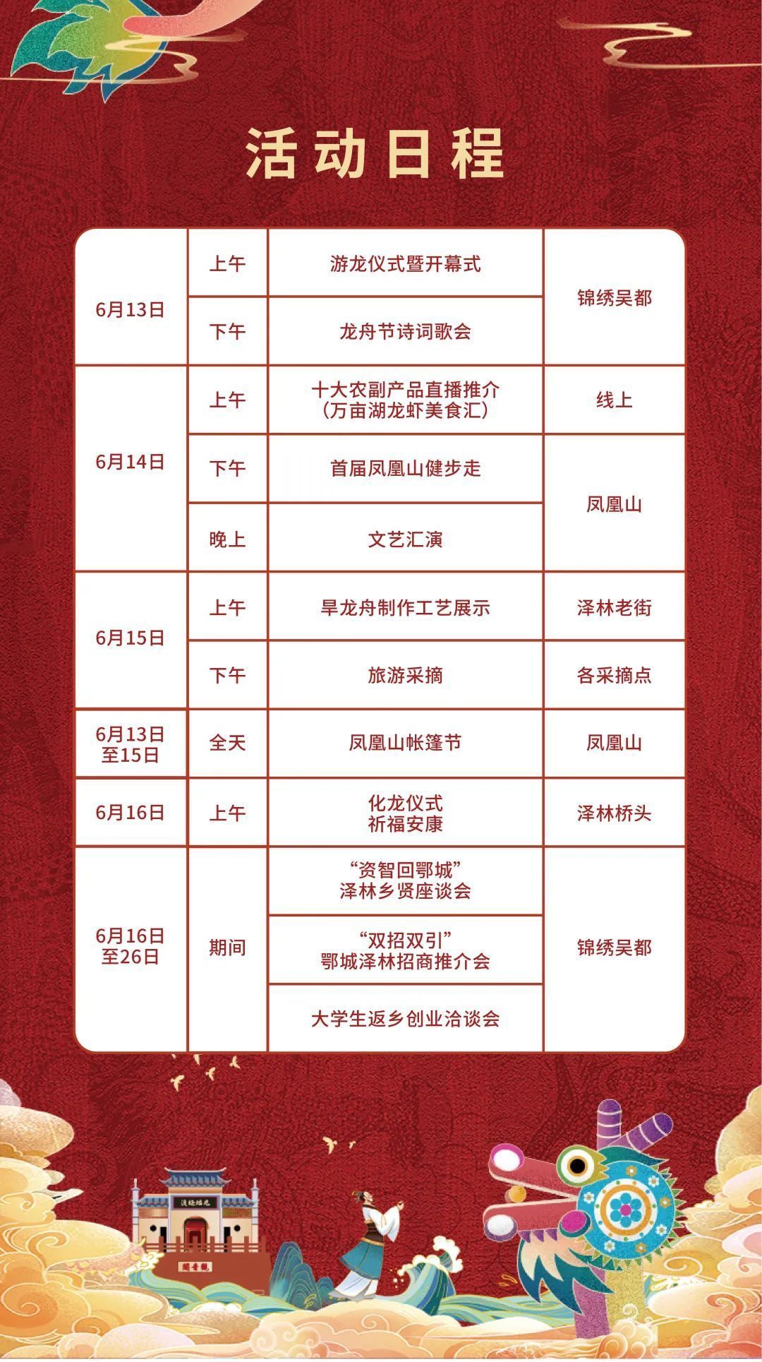 據(jù)悉,節(jié)日期間,澤林鎮(zhèn)每天均會(huì)組織各種豐富多彩的文旅體驗(yàn)活動(dòng),活動(dòng)以線上為主,線下為輔,打造了包括旱龍舟巡游、詩詞歌會(huì)、健步走運(yùn)動(dòng)、文藝匯演、旱龍舟制作工藝展示、特色農(nóng)副產(chǎn)品展銷、旅游采摘、鳳凰山帳篷節(jié)、化龍祈福等九大活動(dòng),同期還將舉辦鄉(xiāng)賢座談會(huì)、招商推介會(huì)、大學(xué)生返鄉(xiāng)創(chuàng)業(yè)洽談會(huì)等各項(xiàng)會(huì)議。