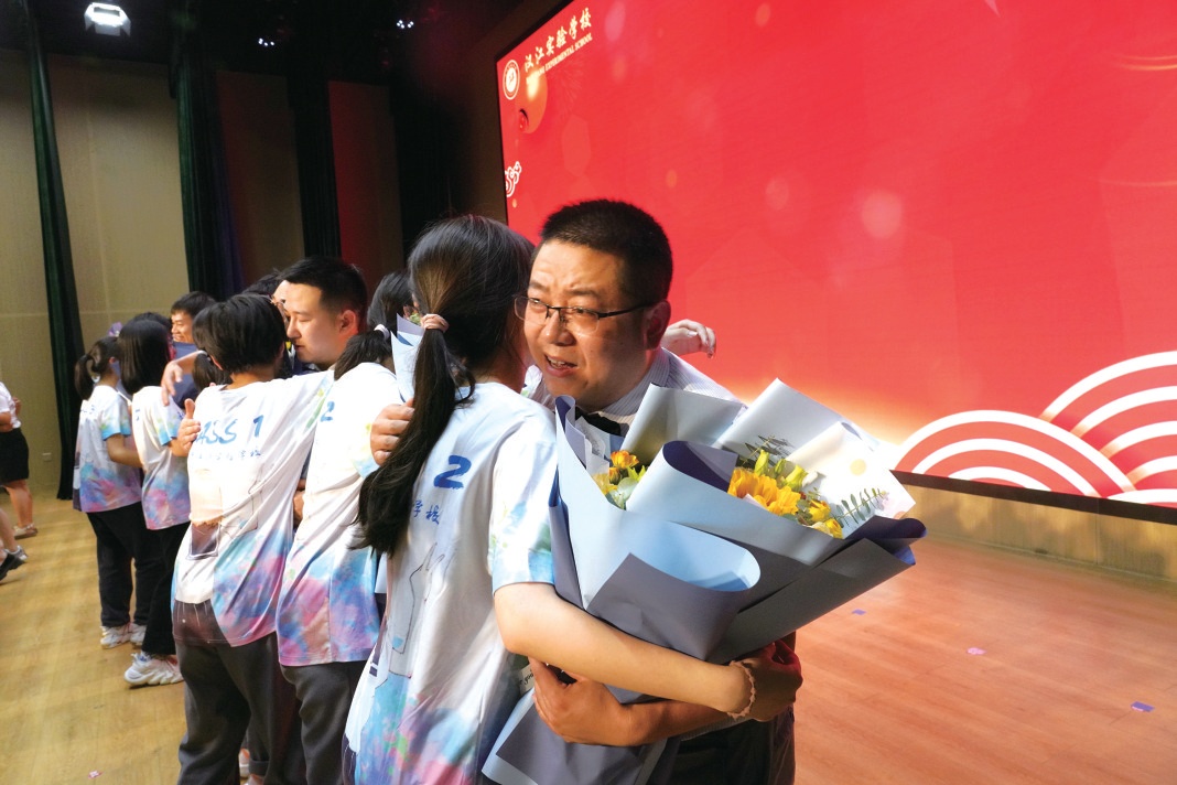 6月17日,漢江實(shí)驗(yàn)學(xué)校舉行“傳承榮光·感恩母?!?022屆九年級畢業(yè)典禮,為即將參加中考的學(xué)子們加油鼓勁。圖為學(xué)生與老師擁抱,表達(dá)感激之情。圖/通訊員 涂銀玥 鮑玉