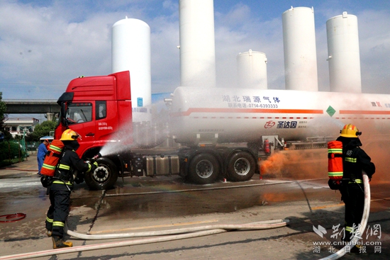 演練模擬高溫天氣工人裝卸液化氣操作不當(dāng),引發(fā)火災(zāi),火勢蔓延危及臨近廠區(qū)安全。企業(yè)隨即啟動應(yīng)急救援預(yù)案,組織企業(yè)微型消防站撲救初起火災(zāi)并撥打119進行報警。
