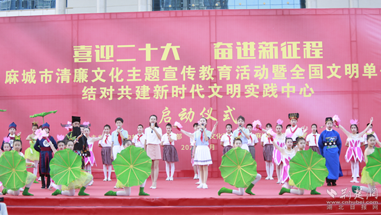 荊楚網(wǎng)(湖北日報網(wǎng))訊(通訊員謝靖)“濯濯清漣,亭亭清蓮,一品清廉,愛蓮,更贊廉?!?月29日,在麻城市清廉文化宣傳教育活動暨全國文明單位結對共建啟動儀式上,麻城市實驗二小的情景劇《一品清廉》傳來聲聲清脆的倡廉之聲,贏得現(xiàn)場觀眾陣陣掌聲。