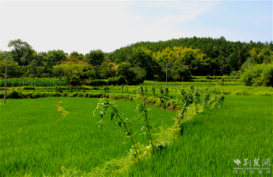 烈日下,放眼一片青綠,水稻正茁壯生長,田邊作業(yè)路寬闊平坦。不難想象,轉眼的秋天,這里將是滿畈金黃,一派收獲的景象。
