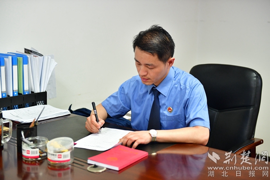 “他對(duì)待工作認(rèn)真細(xì)致?!薄八恢痹谵k案一線。”“他是我院一面屹立不倒的紅旗?!蓖驴谥泻迷u(píng)不斷的他,是蘄春縣檢察院第三檢察部主任袁國(guó)斌,一名退伍老兵。