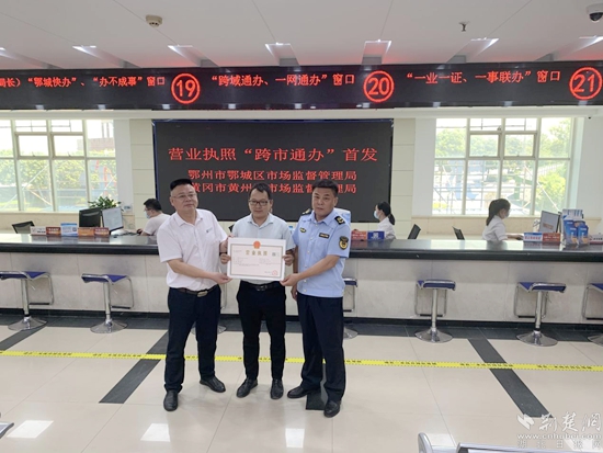 鄂城區(qū)市場(chǎng)監(jiān)管局頒發(fā)的首張“跨市通辦”營(yíng)業(yè)執(zhí)照。通訊員 供圖
