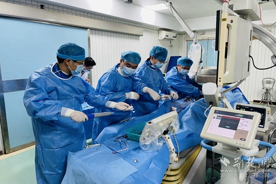 在完善各項術前檢查后,普外1科副主任陳加新,醫(yī)師柯章明、周義在華中科技大學同濟醫(yī)學院附屬協(xié)和醫(yī)院血管外科教授劉建勇的指導下,為患者成功施行了經股動脈置管腹主動脈瘤覆膜支架置入術+右側髂動脈栓塞術。