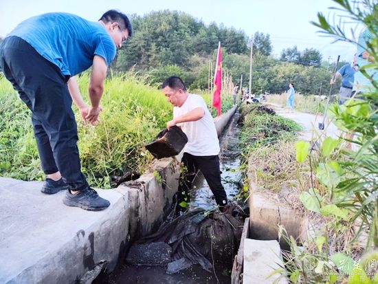 黨員沖鋒永遠(yuǎn)在一線,半人深的溝渠里,村書記郭成志一馬當(dāng)先,一頭扎進(jìn)泥溝里,揮鍬鏟沙,弄的渾身都是泥漿。6米長的涵管堵塞嚴(yán)重,他第一個(gè)跳下去,趴在狹小空間里一鍬一鏟的清理淤泥雜物。