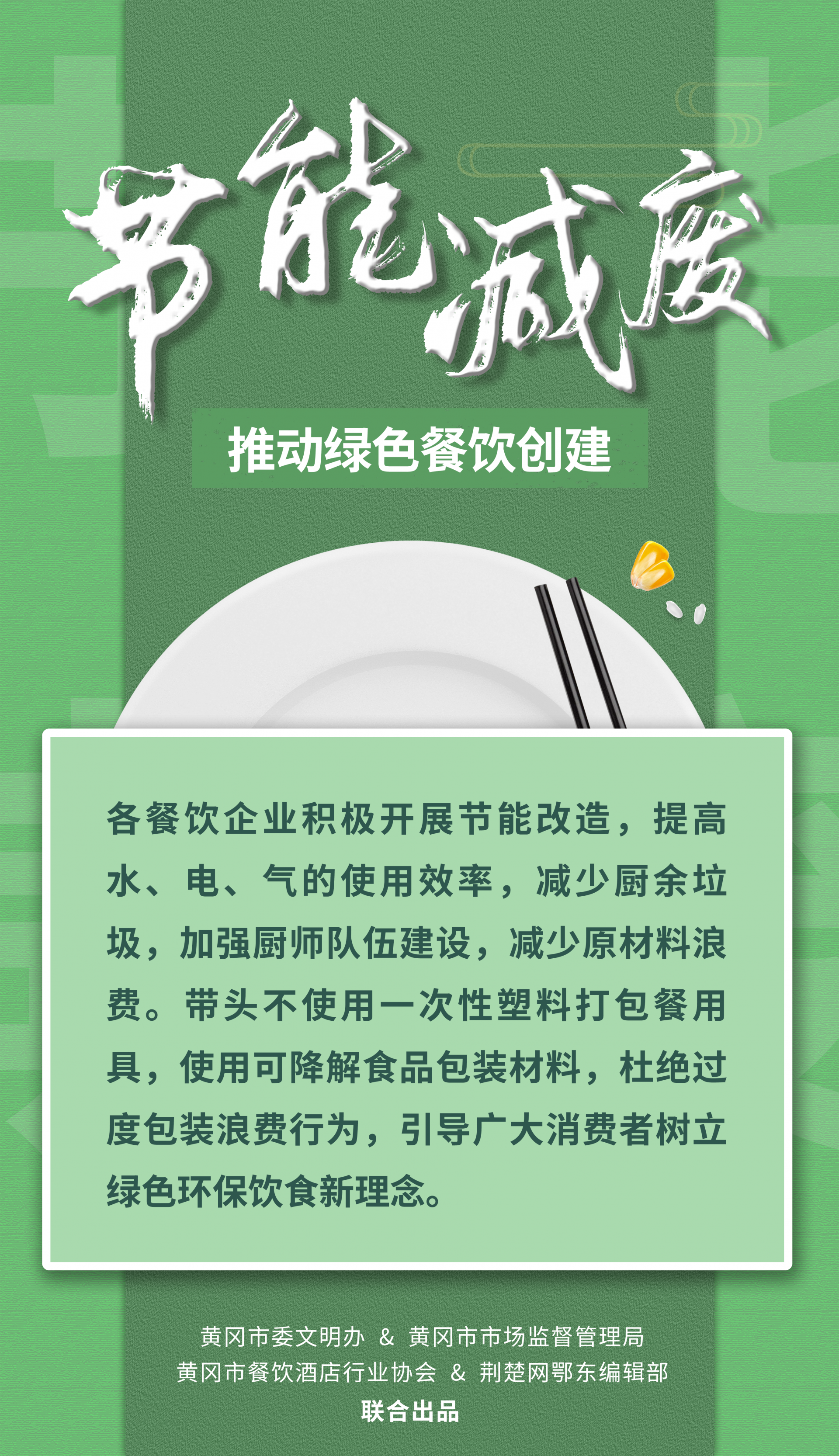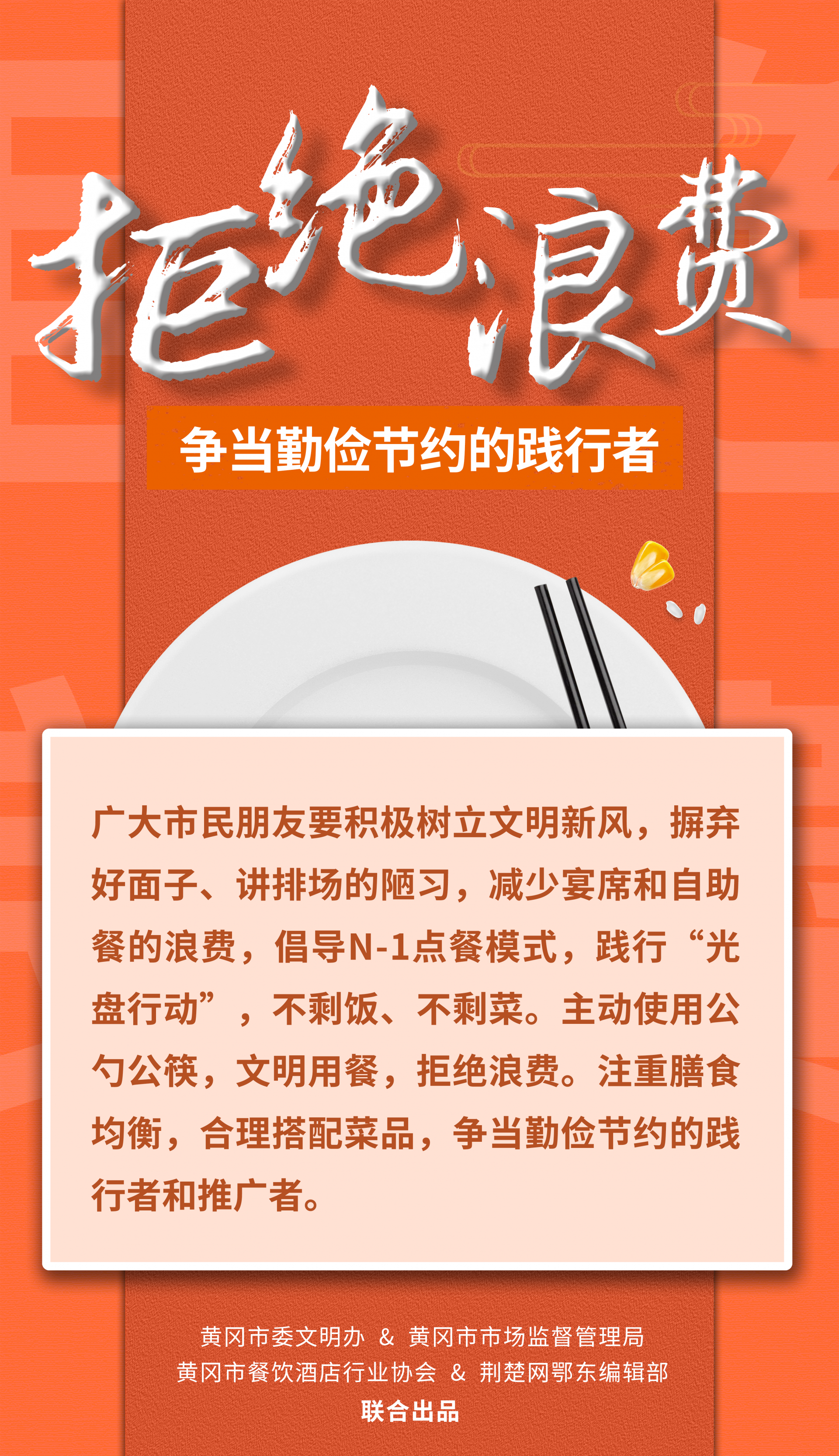 荊楚網(wǎng)(湖北日?qǐng)?bào)網(wǎng))訊(記者陶輝 姜夢(mèng)瑤 通訊員張開(kāi)宇 姜文馨)一粥一飯,當(dāng)思來(lái)之不易。為引導(dǎo)餐飲行業(yè)健康綠色發(fā)展,踐行“文明用餐、反對(duì)浪費(fèi)”時(shí)代新風(fēng),堅(jiān)決制止餐飲浪費(fèi)行為,9月14日,黃岡市委文明辦、黃岡市市場(chǎng)監(jiān)督管理局、黃岡市餐飲酒店行業(yè)協(xié)會(huì)聯(lián)合向全市餐飲行業(yè)、廣大市民朋友發(fā)出倡議。