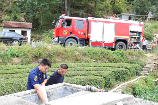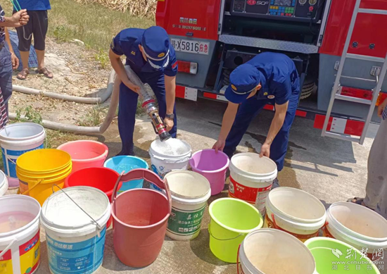 消防人員到達(dá)占昌塆村后,迅速鋪設(shè)水帶、接好水槍、打開(kāi)水閥,將水注入該村的公用蓄水池和前來(lái)挑水的村民水桶里,為村民送水12噸。