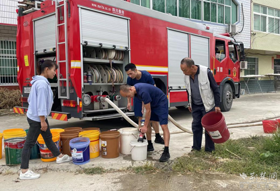 英山縣消防救援大隊(duì)接警后,立即調(diào)派一輛水罐消防車和三名消防員趕往離縣城二十多公里外的南河鎮(zhèn)占昌塆村,分別為兩個(gè)小組村民送水解民憂。