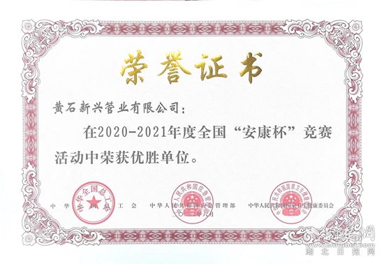 荊楚網(wǎng)(湖北日?qǐng)?bào)網(wǎng))訊(通訊員 石國良 柯雪梅)近日,中華全國總工會(huì)、應(yīng)急管理部、國家衛(wèi)生健康委員會(huì)聯(lián)合發(fā)文,表彰2020年-2021年度全國“安康杯”競賽活動(dòng)先進(jìn)集體和優(yōu)秀個(gè)人。其中,黃石新興管業(yè)被評(píng)為2020-2021年度全國“安康杯”競賽活動(dòng)優(yōu)勝單位。