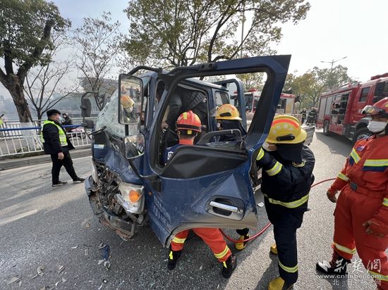 消防救援人員到達(dá)事故現(xiàn)場后,發(fā)現(xiàn)事故貨車的駕駛室因受猛烈撞擊發(fā)生變形,車門無法打開,駕駛室內(nèi)困有一名司機(jī),其精神狀況良好。