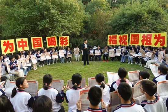 同學(xué)們手舉“踔厲奮發(fā) 砥礪前行”“為中國(guó)喝彩 為祖國(guó)祝福”等標(biāo)牌互動(dòng)熱烈。
