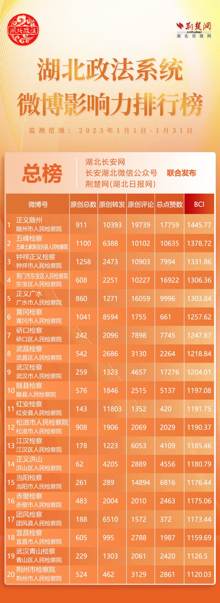 湖北政法系統(tǒng)495個(gè)官方微博賬號(hào)參加評(píng)選,政法委系統(tǒng)10個(gè)、法院系統(tǒng)98個(gè)、檢察系統(tǒng)130個(gè)、公安系統(tǒng)244個(gè)、司法系統(tǒng)13個(gè)。 “黃岡檢察”、“紅安檢察”、“團(tuán)風(fēng)檢察”3家單位上榜,分別排名第6位、第11位、第17位。