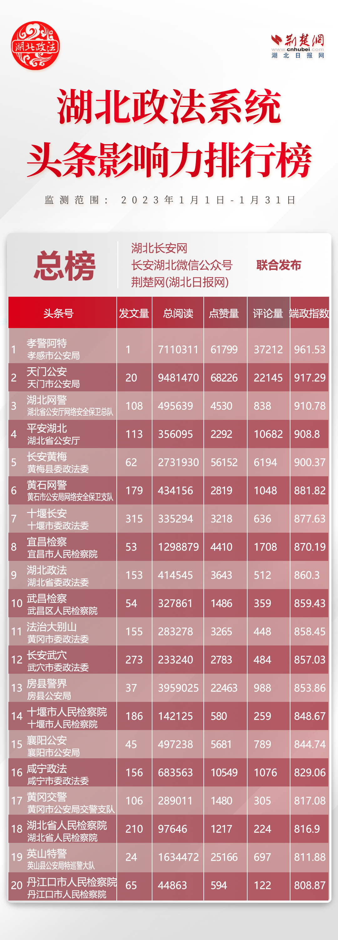 荊楚網(wǎng)(湖北日?qǐng)?bào)網(wǎng))訊(記者胡小軍)2月13日,湖北省委政法委官網(wǎng)湖北長(zhǎng)安網(wǎng)、官微長(zhǎng)安湖北聯(lián)合荊楚網(wǎng)(湖北日?qǐng)?bào)網(wǎng))、楚天輿情數(shù)據(jù)研究院發(fā)布湖北政法系統(tǒng)新媒體影響力排行1月榜單,黃岡政法系統(tǒng)多家單位入圍。