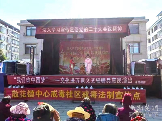 當天,浠水縣楚劇團到該村開展送戲下鄉(xiāng)活動,現(xiàn)場群眾絡(luò)繹不絕,浠水縣公安局禁毒大隊聯(lián)合散花鎮(zhèn)中心戒毒社區(qū)借活動演出時機,在現(xiàn)場開展毒品預(yù)防宣傳教育活動,共發(fā)放宣傳資料200余份,解答相關(guān)咨詢30余人。