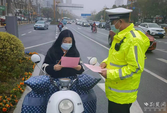 荊楚網(wǎng)(湖北日報(bào)網(wǎng))訊(通訊員肖杰、王睿)“您好,您這樣不戴安全頭盔騎行電動車非常危險(xiǎn)……”3月21日清晨,麻城市公安局交警大隊(duì)輔警李彬正在雨中值勤,向過往車輛散發(fā)文明交通宣傳單,并對駕乘電動車不戴安全頭盔、逆向行駛、違法載人、隨意抄近路等交通違法行為進(jìn)行勸導(dǎo),提醒市民時(shí)刻謹(jǐn)記交通規(guī)則,安全文明出行。
