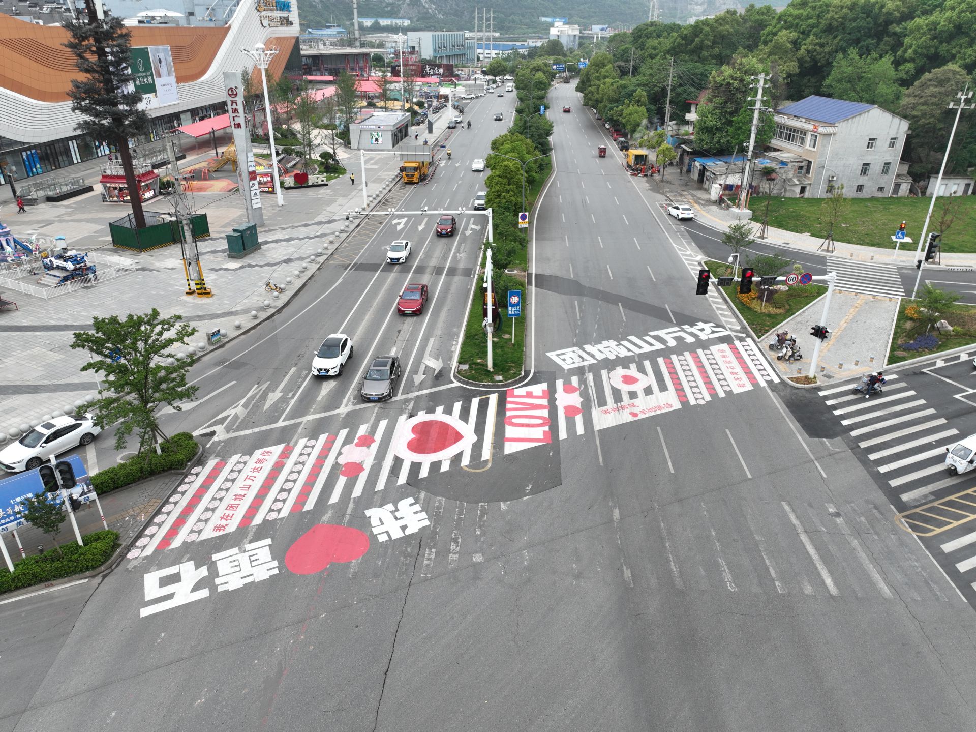 28日上午,在多個視頻平臺里,出現(xiàn)了一條黃石“網紅斑馬線”,這條斑馬線位于磁湖路與廣州路路口靠近團城山萬達廣場一側,不少市民來到現(xiàn)場打卡拍照,還有市民在現(xiàn)場拍攝視頻。記者隨后來到現(xiàn)場看到,這條原本黑白相間的斑馬線,被涂畫了桃心、花朵圖案,并配上了“團城山萬達”“我在團城山萬達等你”“我在等風也在等你”“我在黃石很想你”“我 黃石”“LOVE”等字樣?,F(xiàn)場確實也有些市民掏出手機,對這條斑馬線進行拍攝。