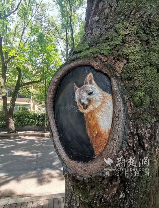 從溫泉谷到黨校入口處的山體雜草和垃圾已清理干凈,種上了耐陰的繡球花、彩葉草、網(wǎng)紋草等花草,展現(xiàn)出別樣風情;街對面的道行樹上放上了仿真松鼠、貓頭鷹和桂花,樹洞橫截面“長滿”了松鼠、龍貓,淦河邊步道旁磚砌的窨井蓋因勢利導,做成了樹樁的模樣,配上微塑蘑菇,幾可以假亂真;電箱穿上了風景類的彩繪新衣……栩栩如生的小動物和與周圍環(huán)境渾然一體的彩繪,讓新升級的月亮灣網(wǎng)紅路“萌化”了!