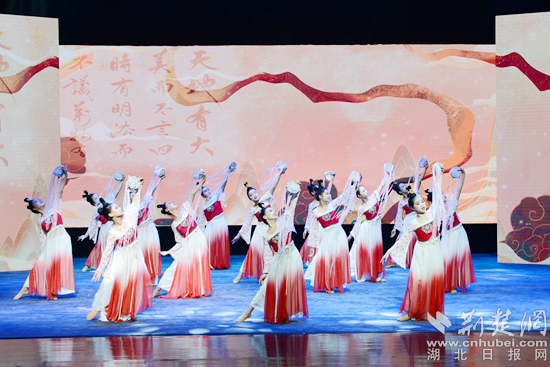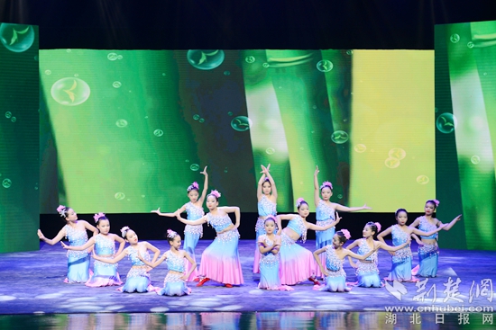 舞蹈《且吟春雨》《看了你一眼》婀娜曼妙,韻味十足。舞蹈《把愛寄回家》纏綿婉轉(zhuǎn),真情再現(xiàn)了一群留守兒童收到父母的快遞,思念父母的情景,表達(dá)留守兒童的心聲和期盼,呼吁社會(huì)給予他們更多的關(guān)愛。舞蹈《楚鼓聲聲》鏗鏘有力,再現(xiàn)了泱泱大國威武雄風(fēng)。