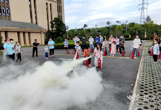 演練時,消防宣傳員組織院內(nèi)兒童在樓內(nèi)的活動空間及逃生通道進(jìn)行疏散演練。所有人牢記彎腰、低頭、捂住口鼻三大要點,沉著應(yīng)對,迅速從安全通道撤離到廣場。隨后,在廣場上所有兒童按照消防宣傳員教授的方法:提、拉、握、壓四個步驟,正確使用滅火器進(jìn)行滅火演練。