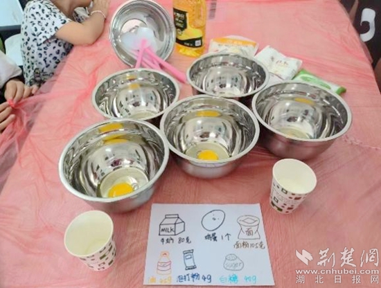 雞蛋、牛奶、面粉、白糖……在志愿者們的指導(dǎo)下,小朋友們添加食材、攪拌,現(xiàn)場井井有條。孩子們盡情享受“創(chuàng)造”的過程,不到一會時(shí)間,一塊塊香氣四溢的小蛋糕就端上了桌。