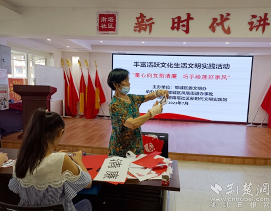 荊楚網(湖北日報網)訊(通訊員 丁元中)一刀一剪揚正氣,一毫一厘頌清風。7月12日上午,鄂城區(qū)鳳凰街道南塔社區(qū)聯(lián)合鄂州市婦聯(lián)、鄂城區(qū)婦聯(lián)、鳳凰街道婦聯(lián)開展了“童心向黨剪清廉,巧手繪蓮好家風”剪紙活動,將廉政素材與傳統(tǒng)剪紙相結合,用民俗藝術展現(xiàn)清廉之風。