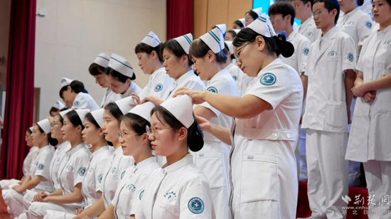 在激昂的黃岡市中心醫(yī)院院歌中,專家前輩和護(hù)士長(zhǎng)代表為新職工們佩戴聽診器和燕尾帽,并一起重溫了中國醫(yī)師宣言和南丁格爾誓詞。新職工們肅然站立、莊嚴(yán)宣誓,鏗鏘有力的誓言久久回蕩。一張張青春洋溢的臉龐,一聲聲莊嚴(yán)的承諾,都詮釋著投身醫(yī)療事業(yè)的無限榮光。