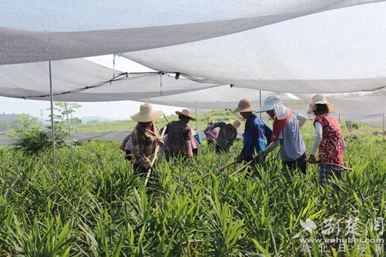 荊楚網(湖北日報網)訊(通訊員 葛昆樂 馬先禮)8月4日上午,位于鄂城區(qū)汀祖鎮(zhèn)劉顯村的鄂城黃姜育種示范基地里,120畝黃姜長勢喜人,十多名工作人員正在進行田間管理,為黃姜施肥、鋤草。