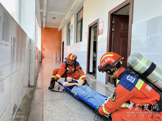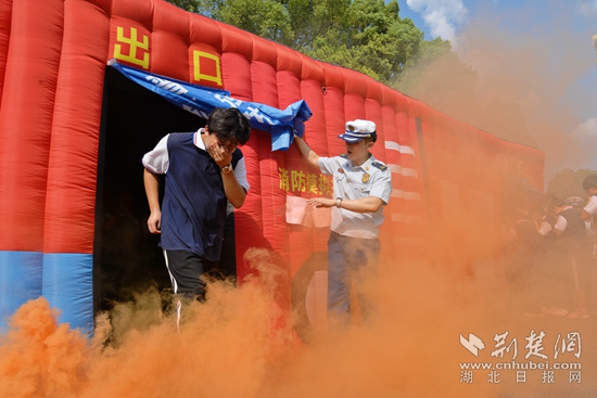 伴隨著陣陣緊促的警笛聲在校園響起,一教室內(nèi)“電線短路”,引燃桌面書籍,頓時(shí)濃煙滾滾?!罢?qǐng)各位同學(xué)不要驚慌,捂住口鼻、低頭彎腰、貼墻往樓下有效進(jìn)行疏散......”廣播中傳來疏散指令,消防員指導(dǎo)全體師生從“安全出口”有序迅速撤離,通過體驗(yàn)“生命通道”,使師生掌握火場疏散逃生技能。