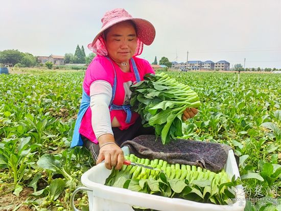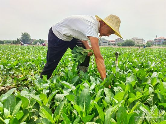 在黃梅縣分路鎮(zhèn)鼎旺農(nóng)業(yè)農(nóng)民專業(yè)合作社廣東菜心種植基地,近100名割菜工手戴指甲刀,在技術(shù)顧問(wèn)呂美標(biāo)的指揮下,分散到各個(gè)地塊,不一會(huì)兒,路兩旁就整齊堆滿了菜心,合作社社長(zhǎng)石成旺拿出手機(jī)聯(lián)系車輛,經(jīng)過(guò)整理、清洗,剛收割的菜心就被送到凍庫(kù),準(zhǔn)備第二天運(yùn)往國(guó)內(nèi)外。