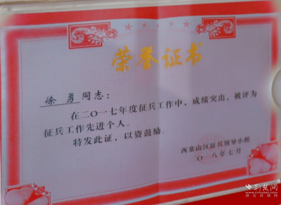 1994年12月10日一早,徐勇穿著嶄新的軍裝,背著背包在家等候。上午9時(shí)許,源建里社區(qū)居民委員會(huì)一行人敲鑼打鼓地來(lái)到徐勇家里,將一朵鮮艷的大紅花戴在徐勇胸前,一路將徐勇送到石灰窯區(qū)(現(xiàn)西塞山區(qū))政府。