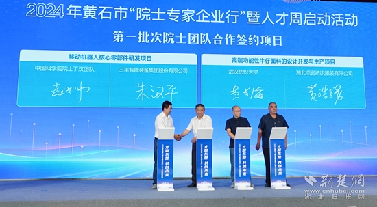 現(xiàn)場還舉行了項(xiàng)目簽約活動,簽約移動機(jī)器人核心零部件研發(fā)項(xiàng)目、高端功能性牛仔面料的設(shè)計(jì)開發(fā)與生產(chǎn)項(xiàng)目等2個院士專家合作項(xiàng)目、球墨鑄鐵管壁測量項(xiàng)目等10個人才合作項(xiàng)目以及4個人才服務(wù)合作項(xiàng)目,并為鄂東技師學(xué)院國家級高技能人才培訓(xùn)基地授牌。