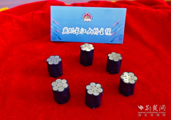 燕磯長江大橋的項目書記、工會主席喻林峰介紹,這6根鋼索來自燕磯長江大橋的主纜,它是2100兆帕的高強鋼索。燕磯長江大橋是世界最大跨徑四主纜懸索橋,同時也是世界首座不同垂度四主纜雙層鋼桁梁懸索橋。大橋一共有四根主纜,每根主纜有217根索股,每根索股由127根如此次捐贈的鋼索構(gòu)成。