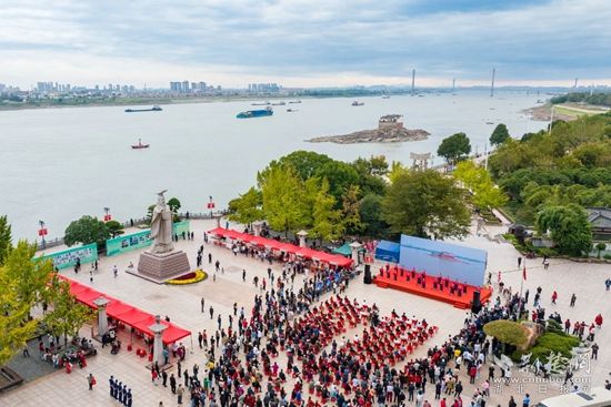 鑼鼓表演《中國范兒》、朗誦串燒《萬里長江第一閣》、楚風楚韻《編鐘樂舞》……當天上午,熱鬧非凡的孫權廣場與江中靜靜矗立著的觀音閣遙遙相望,眾多文藝節(jié)目輪番上演,為現(xiàn)場群眾提供了一場古風古韻的視聽盛宴。