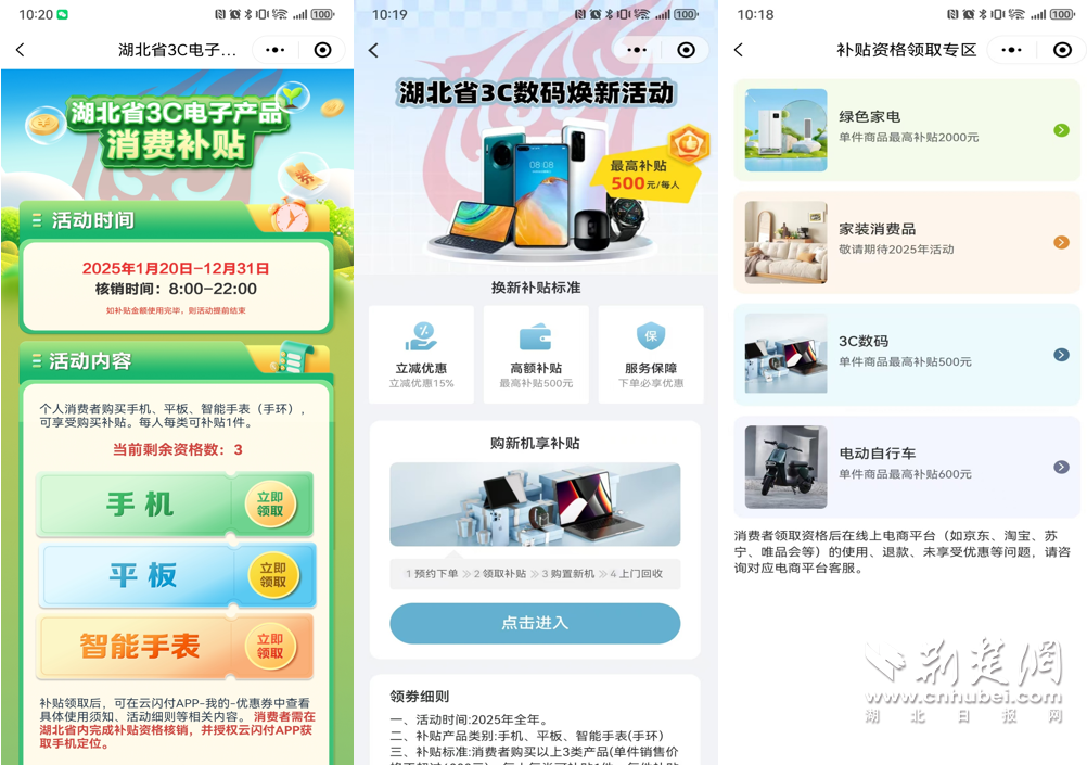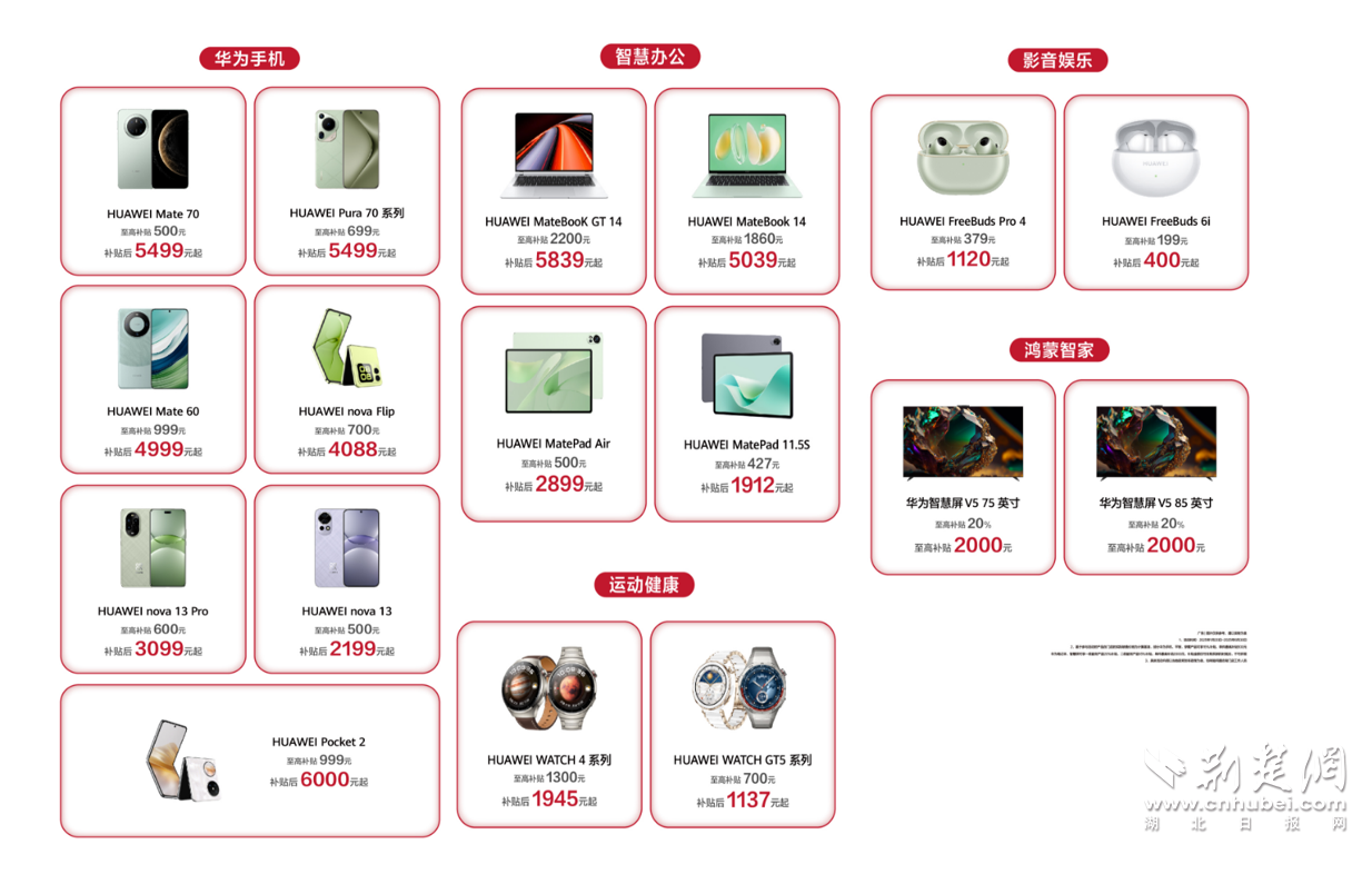 荊楚網(wǎng)(湖北日報網(wǎng))訊 (通訊員 高洋)2025年1月20日,“國補”政策首次擴(kuò)圍至消費電子行業(yè)。對個人消費者購買華為手機(jī)、平板、智能手表手環(huán)等3類數(shù)碼產(chǎn)品(單件銷售價格不超過6000元),按產(chǎn)品銷售價格的15%給予補貼,每位消費者每類產(chǎn)品可補貼1件,每件補貼不超過500元。對于想要購買華為手機(jī)的消費者來說,這波優(yōu)惠力度拉滿。