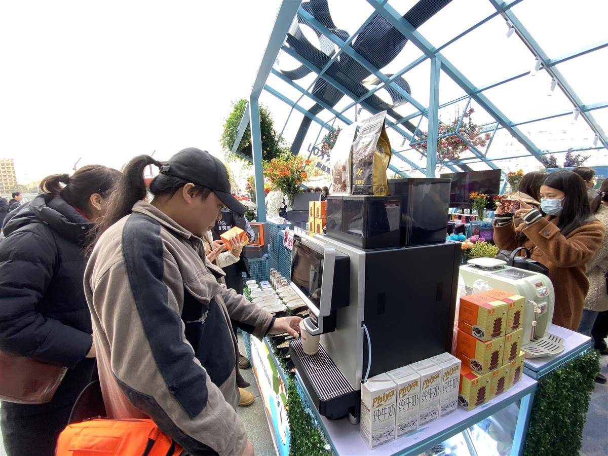 在武商夢時代“國潮好物市集”,不少市民在漢口北國際貿(mào)易城展區(qū)體驗自動咖啡機。(記者劉天縱攝)