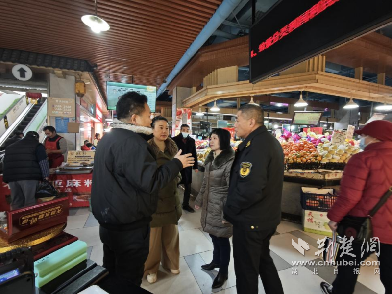 嚴(yán)密開展農(nóng)貿(mào)市場“優(yōu)秩序保安全迎新年”專項督查行動,分管領(lǐng)導(dǎo)帶隊檢查了東湖景園市場,重點檢查了市場內(nèi)外環(huán)境衛(wèi)生、長江漢江魚禁售、計量電子秤、保供穩(wěn)價、消防安全等情況。