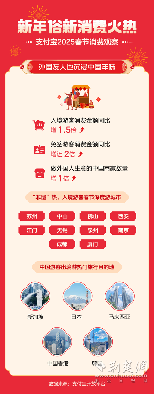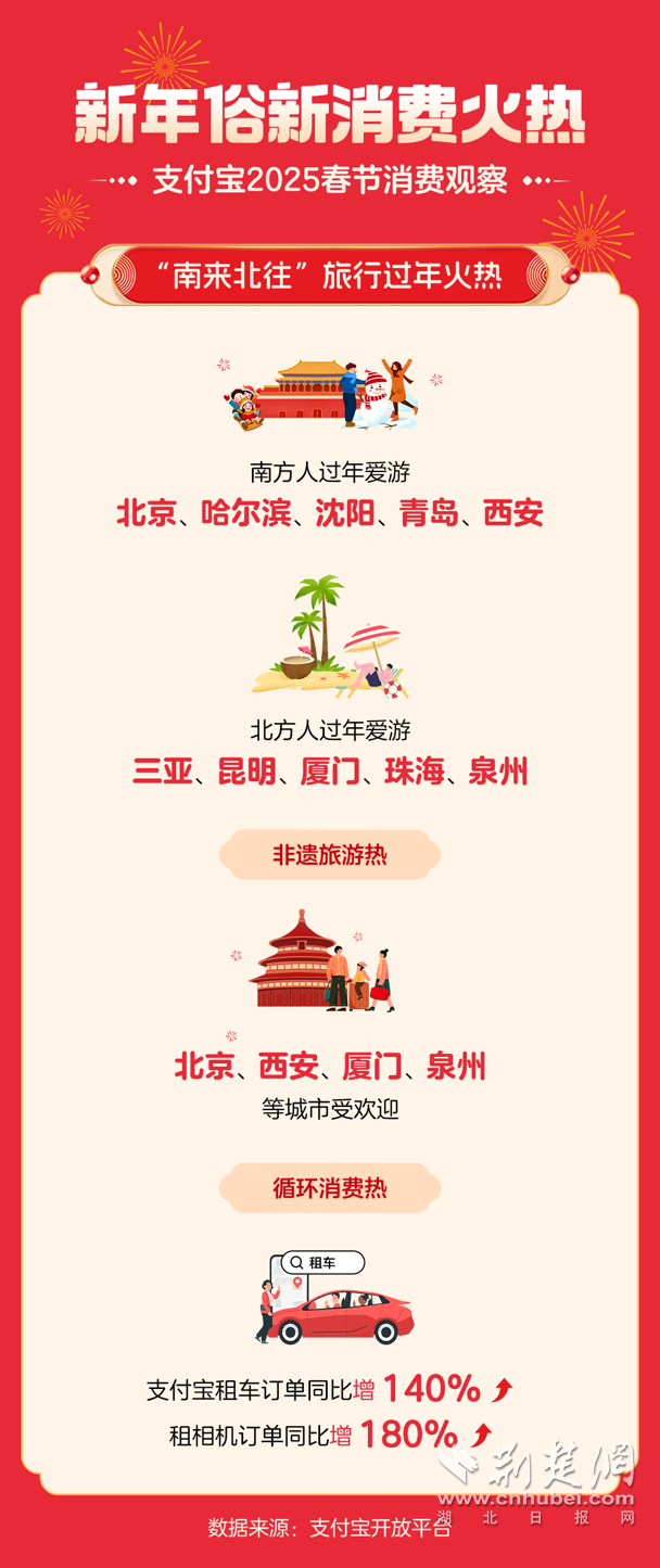 在春節(jié)成功申遺后的第一年,支付寶集福這一數(shù)字新年俗吸引了近 6 億人參與;不少外國友人也在各地感受著中國濃濃的年味,賞美景品美食,消費熱情高漲;“南來北往”旅游過年潮已然興起,非遺體驗、冰雪景點游、綠色循環(huán)消費等各種特色旅行方式層出不窮。