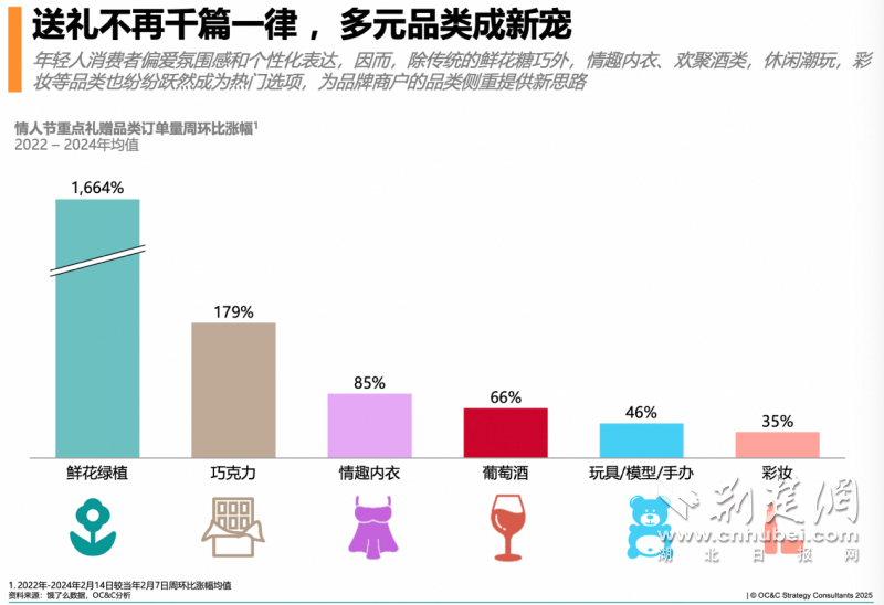 荊楚網(wǎng)(湖北日?qǐng)?bào)網(wǎng))訊(通訊員 易曄)元宵才過(guò),情人節(jié)接檔。零售品牌商戶們毫不猶豫步入下一個(gè)生意高峰,過(guò)節(jié)的愛(ài)人們也不慌不忙在節(jié)日當(dāng)天開(kāi)始籌備浪漫表達(dá)。近日,餓了么聯(lián)合戰(zhàn)略咨詢公司OC&C共同發(fā)布的《情人節(jié)即時(shí)零售禮贈(zèng)趨勢(shì)與品類機(jī)遇洞察》顯示,過(guò)去三年情人節(jié)當(dāng)天,重點(diǎn)禮贈(zèng)品類的外賣單量較12日環(huán)比增長(zhǎng)超過(guò)3倍,且當(dāng)日送禮訂單在晚間(17-21點(diǎn))需求持續(xù)增長(zhǎng)。
