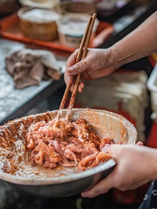 定型是制作肉糕時最考驗(yàn)功夫的一步,處理好的肉餡要均勻鋪在墊好千張的蒸屜上,不僅可以定型,同時還能吸收肉汁,使口感更為鮮美。
