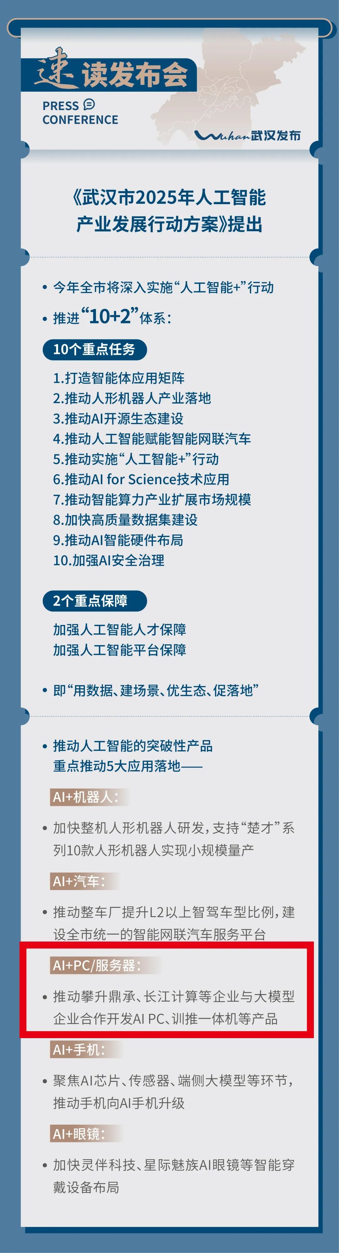 3月10日,《武漢市2025年人工智能產(chǎn)業(yè)發(fā)展行動方案》新聞發(fā)布會召開?!缎袆臃桨浮访鞔_將“AI+PC/服務器”列為推動人工智能的突破性產(chǎn)品,作為五大重點應用之一予以落地,并點名支持攀升科技等企業(yè)聯(lián)合大模型廠商,攻關 AIPC等產(chǎn)品。